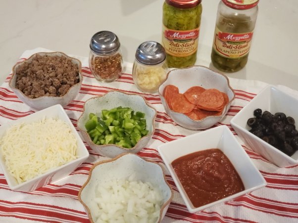 We are all about the ingredients in this house. Chop up what you want and add some variety. In my mind there can never be too many toppings. I love them all! Some our favorites: Mozzarella cheese (shredded or sliced), pepperoni, olives, sausage (cooked ahead), bell peppers, onions, jalapeños, and mushrooms.