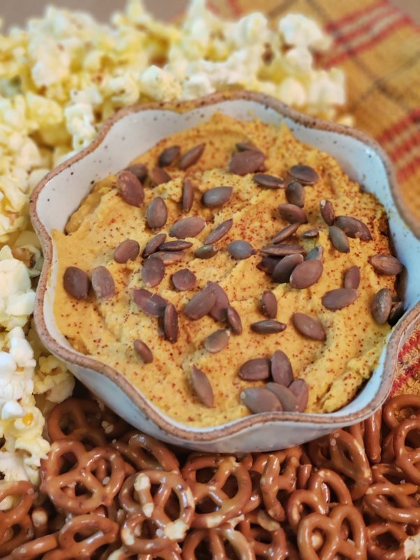 My Smoky Pumpkin Spice Hummus is a versatile dip that you could have any time of year, but tastes especially great as the season of pumpkin spice everything is upon us.  At our house, we enjoy throwing in popcorn, pretzels and pita chips along with the usual veggies.